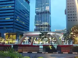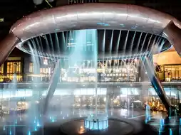 The Fountain of Wealth is located in the middle of the shopping mall, all 5 buildings. All buildings are like 5 fingers.