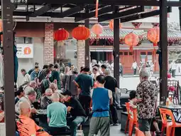 🍁 It was raining a little on the day we went. ☔️ It was a bit sticky, but the good thing is that there weren't many people, which I really liked. The atmosphere in the temple is quiet, with a little breeze to keep it from being too hot (but it's still stuffy). Most of the people are Singaporeans and Chinese people. They go to pray, read scriptures (?), and there's also a Go club in the back.