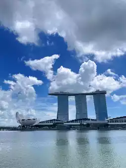 Across from the Merlion, you will see a round building like a jackfruit, which is the Esplanade Theatre. On the other side is the Marina Bay Sands, a 5-star resort and casino with 57 floors and 3 buildings connected together. The rooftop is designed as a ship. It is very modern and is the most expensive casino building in the world. 💵