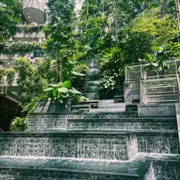 The HSBC Rain Vortex, a massive artificial waterfall flowing in the center of the complex, is 40 meters long and is the largest indoor artificial waterfall in the world! It's so refreshing to be near the waterfall! 😊