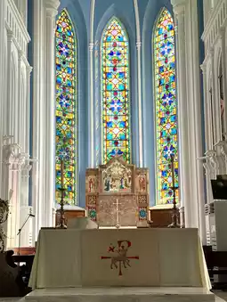 It is a beautiful white Gothic cathedral built in a large park-like area, and when you go inside, you can see beautiful stained glass in the center of the cathedral.