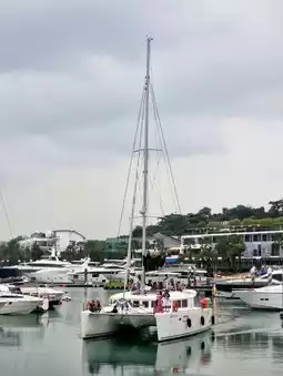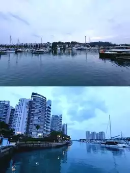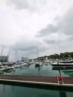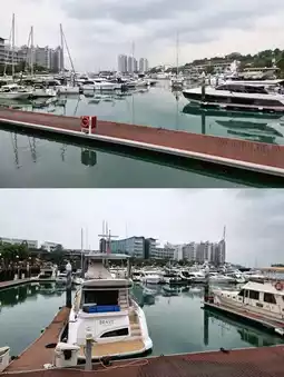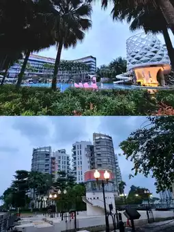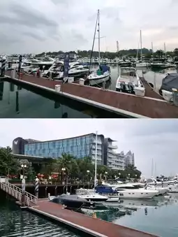 A stroll through Sentosa Cove at twilight is a mesmerizing experience. The waterfront promenade offers stunning views, capturing the essence of luxury waterfront living alongside the natural beauty of Singapore's coastline. Rows of sleek, high-end yachts are docked in the marina, their lights casting a soft glow onto the calm waters and creating shimmering reflections.