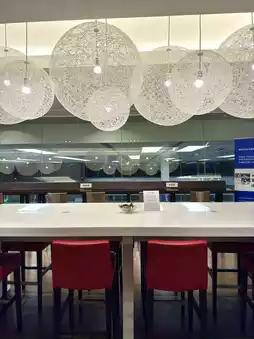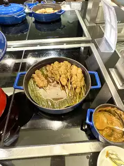 The lounge inside is very stylish, and offers a wide variety of food, including cold meals such as salads, hot meals such as curry, bacon, soup, and satay.