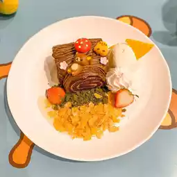 Only 2 vegetarian friendly options avail for dessert, the pancake and chocolate log cake. Decided to order the chocolate log cake and korillakkuma frizzy strawberry soda for the drink. The cake is nice, its soft, moist, topped with rilakkuma chocolate, matcha crumbs, cornflakes, vanilla ice cream and strawberry. Really cute but too pricey (price is $21.90).