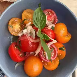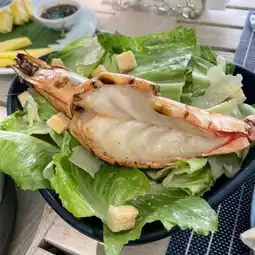 Delicious fresh grilled salmon and the accompanying garnish , cashews and dressing, was absolutely Devine. Herb had fresh Fish with fries and an assortment of perfectly roasted vegetables including whole garlic, pumpkin slices, capsicums and zucchini.