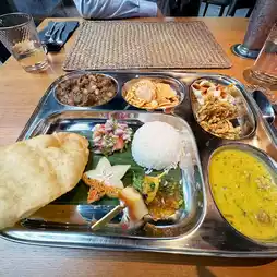 ✔️ Signature set meal includes three items: appetizer + curry + crispy rice sticks + naan