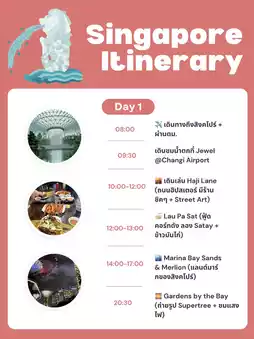 🛬 Land and stop by to see the waterfall at Jewel Changi, then stroll and take photos at Haji Lane, followed by enjoying Satay + Hainanese Chicken Rice at Lau Pa Sat 🌟 In the evening, check in at the landmarks Marina Bay Sands & Merlion, then finish at Gardens by the Bay to watch the spectacular light show.