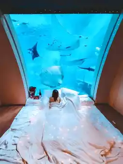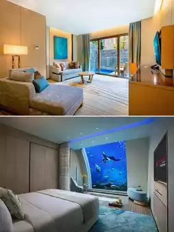 There are only 11 Yitho Underwater Suites, measuring 93 square meters, with a bedroom and living room on two levels. The upper level of the suite features an outdoor terrace and a living room with a jacuzzi, while the lower level features an underwater bedroom with 40,000 fish swimming in front of you. The underwater bedroom has a large window and a bathtub, allowing you to enjoy the underwater world while enjoying your bath time. You can also enjoy breakfast in your room, and a dedicated butler will be on hand to serve you during your stay. You can also enjoy a comfortable holiday with your children by taking a shuttle to Universal Studios, water parks, etc. 🏖️