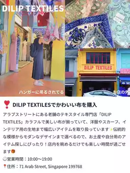DILIP TEXTILES, a long-established textile specialty store located on Arab Street, offers a colorful and beautiful selection of fabrics, handling a wide range of items from clothing and scarves to interior fabrics✨