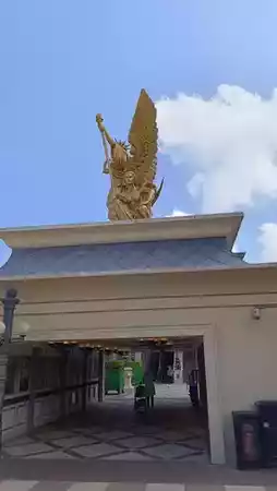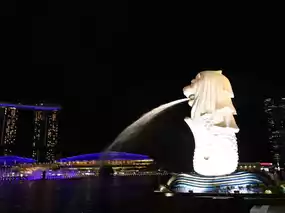 Arriving at the Merlion, tourists were still dense even though it was already evening. The lights were turned on, and there was a fountain show. The colors from the lights were spectacular and grand. It was fun and exciting, even though the weather was a bit hot.