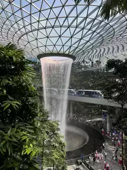 Stepping into Jewel Changi, the first thing that catches your eye is the 40-meter-high indoor waterfall—the Rain Vortex. Water cascades down powerfully, creating a magnificent spectacle. Combined with the stunning surrounding light shows, the interplay of light and shadow is dazzling and brilliant. Every shot you take turns out to be a breathtaking masterpiece, delivering an unparalleled sense of awe!