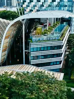 The distant scenery of Mount Faber, staying at JW Marriott Hotel Singapore South Beach, where the luxurious facilities and waterfront views make you feel relaxed the moment you step in. Today, we arrive at Mount Faber Cable Car Station to take the cable car and overlook the magnificent views of Singapore—a dreamy journey high above the ground.