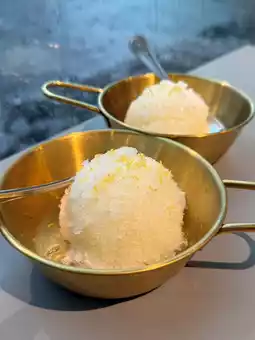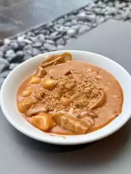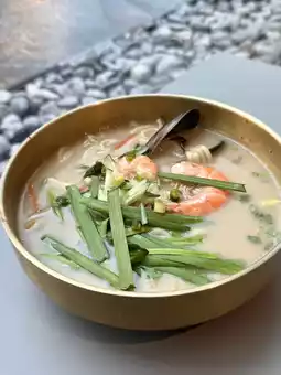 The Sundubu Jjigae is another go-to — soft tofu stew bubbling away in a rich, mildly spicy broth, especially comforting on rainy days. The Gukbap surprised us too: a hearty rice soup in a collagen-rich broth that’s been simmered for 12 hours, full of depth and warmth. On seafood days, we had the Seafood Kalguksu — hand-cut noodles in a light, savoury broth packed with clams and prawns, super slurp-worthy.