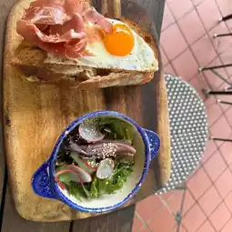 The brunch menu here is thoughtfully curated, and one dish that truly impressed was the porched egg. Cooked to perfection, its gently soft, runny yolk is encased in a delicately crisped white—a texture contrast that elevates every bite. Accompanying this star is a vibrant, refreshing salad that bursts with seasonal greens and a citrusy vinaigrette, perfectly balancing the rich, indulgent flavors of the dish.