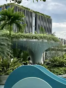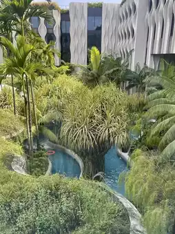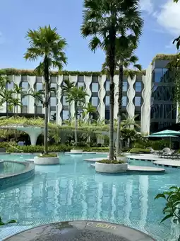 🏝️ Relaxing palm trees, blue swimming pools, and a hotel architecture with elegant curves make this Singapore resort hotel highly recommended 🩵