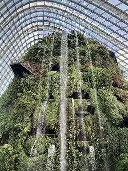 •Cloud Forest: A misty dome with a grand waterfall. Walking inside feels like being in a fantasy world ☁️💦