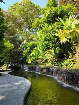 One of the most captivating features was a serene waterway within the 📍National Orchid Garden. A gently flowing stream, adorned with small waterfalls, meandered through lush tropical plants, including broad-leafed palms and various orchids. The soothing sound of cascading water and the vibrant greenery created a truly picturesque and peaceful scene.