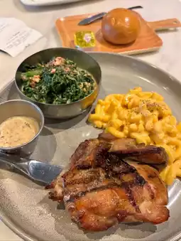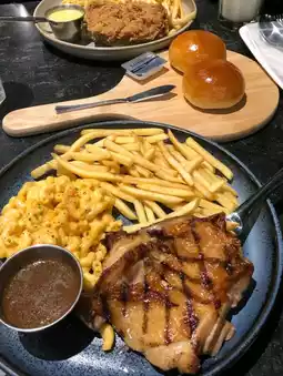 Comes with free flow sides like mashed potatoes, butter corn, aglio olio & coleslaw
