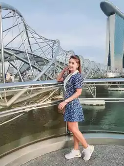 Start at The Helix Bridge 🌉, a futuristic-designed bridge inspired by the DNA helix. The bridge features beautifully curved steel structures, especially in the evening and night when colorful LED lights illuminate, adding a romantic vibe—perfect for cool light prop photography 💡✨