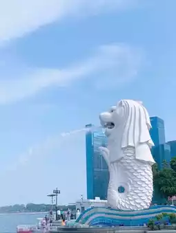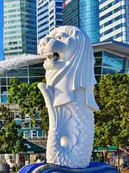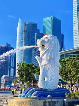 Standing proudly at the edge of Marina Bay, the Merlion statue (half lion, half fish) shoots water into the bay, with Marina Bay Sands glistening in the background – Insta-perfection! 🌉📷