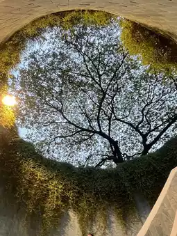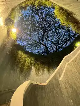 From the underground staircase, look up to see a circular frame of sky wrapped in green. It's magical by twilight — soft light, no tour groups, and quiet birdsong.