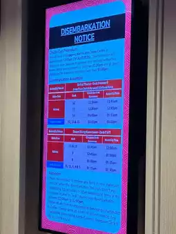 A few hours before arrival, hallway TVs will display your disembarkation schedule by deck. Just follow the signs to your assembly area.