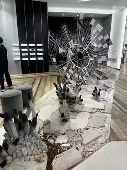 The interior, themed "Data Addicts," features eerie installations scattered under dim lighting,