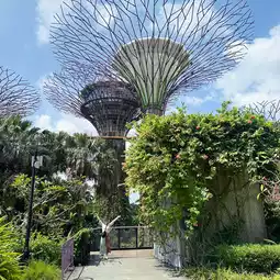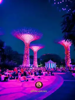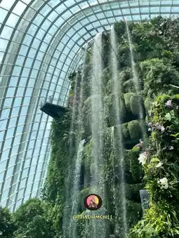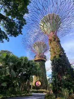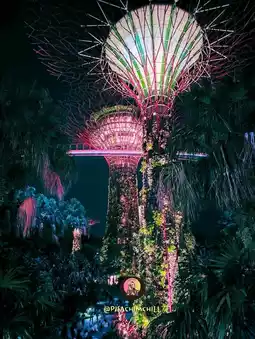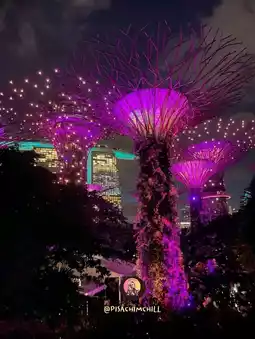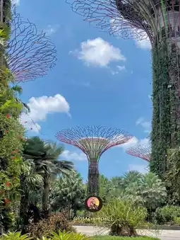 Gardens by the Bay Singapore! When visiting Singapore, you absolutely cannot miss going to Gardens by the Bay. It is a large public park that beautifully combines nature with technology. The main highlight you must see is the Supertrees Grove, a group of giant artificial trees standing 25-50 meters tall. They are not only impressive in appearance but also serve as vertical gardens housing a variety of plant species. At night, there is a spectacular Garden Rhapsody light and sound show that feels like stepping into a fairy tale world. Additionally, there are two giant glass domes you must visit: the Cloud Forest, which feels like a simulated forest with the world's tallest indoor waterfall, and the Flower Dome, where you can stroll among various plants from around the world in a cool, relaxing atmosphere. Personally, I went both during the day and at night to capture the full experience. I can confidently say that if you go to Singapore, you must visit Gardens by the Bay.