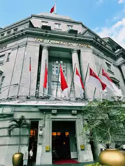 The Fullerton Hotel Singapore, overlooking Marina Bay in the heart of Singapore. This magnificent building is a historic structure that once served as the Central Post Office. The classic colonial architecture exterior harmonizes beautifully with modern luxury, guiding travelers into a special world from the moment they step inside.