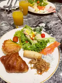 The buffet offered a wide variety of food, from Western to Asian, including omelets, dim sum, salmon, cheese, salads, and even croissants.