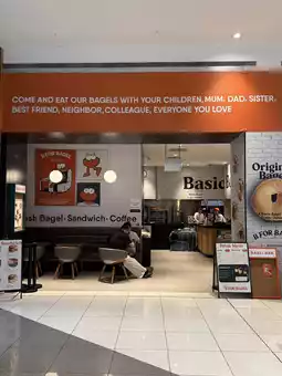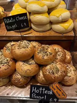The space is cozy and inviting, with a rustic charm reminiscent of artisanal bakeries in Seoul. The bagels are displayed in vibrant colors and are freshly baked, making it hard to choose just one.