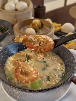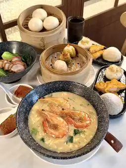 On the menu, you’ll find a wide spread that covers both classics and a few playful twists. Steamed baskets come filled with familiar favourites like har gow, siew mai, and char siu bao, while fried selections such as carrot cake, spring rolls, and golden custard buns add variety. There are also larger plates — noodles, congee, and rice dishes — making it easy to turn a dim sum snack into a full meal.
