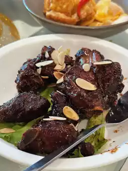 The pork ribs are generously sized, with a caramelized exterior that looks mouthwatering. The flavor is sweet and satisfying.