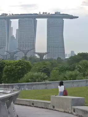 A tranquil public park with a spectacular view of Marina Bay Sands, Supertree Grove, and the Singapore Flyer all in one frame.