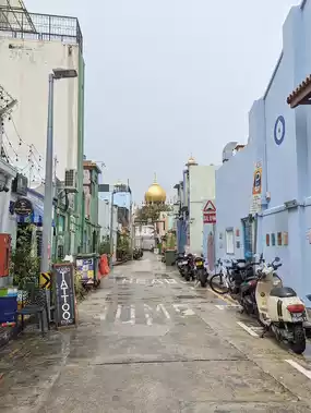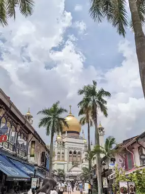 A cultural district featuring the striking golden-domed Sultan Mosque and Haji Lane, a narrow street filled with cafes and vibrant street art.