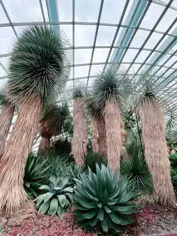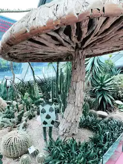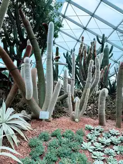 The Arid Garden in the Flower Dome is a desert paradise filled with a fascinating array of cacti and succulents from around the globe. Spot towering Saguaro cacti, plump Golden Barrel cacti, twisted Euphorbias, and flowering Aloe species, all set against dramatic desert landscaping.