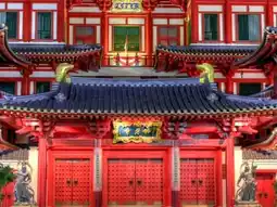 The Buddha Tooth Relic Temple and Museum, located in Singapore's Chinatown, is a Buddhist temple and museum that blends Tang Dynasty architectural style. The temple houses the sacred Buddha Tooth Relic, exuding an atmosphere of solemnity and reverence, attracting countless devotees and visitors. Beyond its religious significance, the temple also features a Buddhist Cultural Museum, showcasing artifacts and artworks that provide deeper insights into Buddhist history. The temple's grand exterior, with its red eaves and golden decorations, stands out prominently in Chinatown, making it a renowned cultural and religious landmark in Singapore.