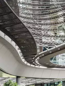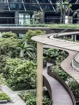 Designed by the international architectural firm Ingenhoven Architects, the twin tower complex features a three-story botanical garden, the "Green Heart," featuring over 400 plant species and waterfalls, creating a tropical rainforest ecosystem within the city.