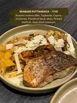 Seabass puttanesca - giving this a lower score probably because we were a bit overloaded with seabass already. The pasta was too oily for my taste. The staff said that someone else said it was too dry the previous week so they added more oil. Would be great to strike a balance by adding another emulsifying liquid?