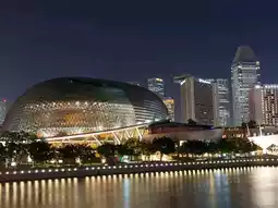 Locals call it the "Durian Theatre," and the Esplanade is Singapore's premier performing arts center. It hosts a variety of performances, including opera, concerts, and ballet. Its domed exterior is a silvery hue during the day and illuminated at night. The adjacent promenade offers panoramic views of Marina Bay.
