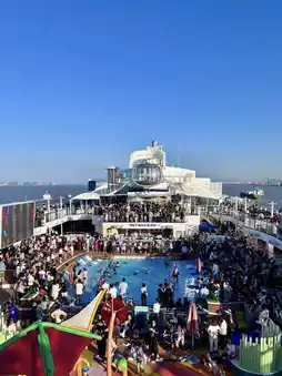 Afternoons were all about relaxation. I spent hours in the Solarium pool, where sunlight filtered through the glass dome — it felt like swimming inside a dream 🌞🏊♀️. Sometimes I joined a dance class or watched families play on the FlowRider surf machine. There was always something happening — you could never be bored here.