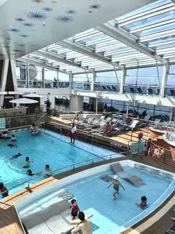 The main theater 🎭 is at the bow, and the main dining room 🍽️ is at the stern. Dinner is served at assigned tables with the same waiter each night. They always had a highchair ready for our baby — such thoughtful service!