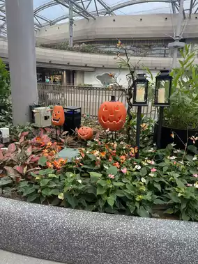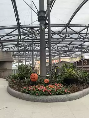 As soon as you step in, you'll see areas decorated in orange, black, and purple tones, with pumpkin structures, witches, and super cute little ghosts adorning the space 🍬. The pink and purple neon lights reflecting off RWS's glass dome make the evening ambiance feel romantic and warmly spooky.