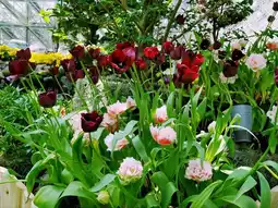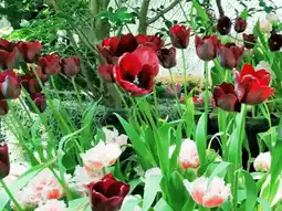Strolling through the Flower Dome feels like stepping into a vibrant ocean of colors. The featured tulips, with their deep wine-red and delicate pink-white hues, become the captivating centerpiece.