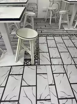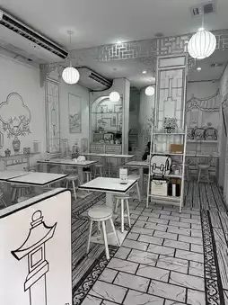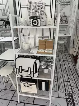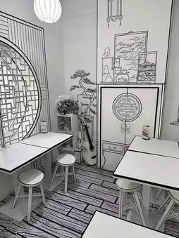 The vibe is peaceful and quirky, perfect for snapping creative shots or just relaxing with a coffee that contrasts beautifully with the black-and-white décor. 🎨📸