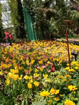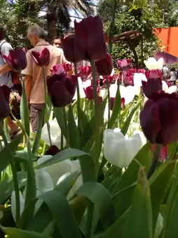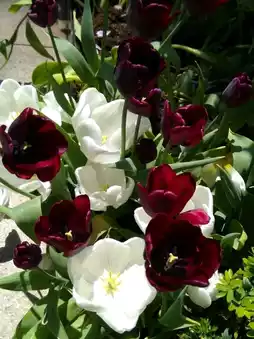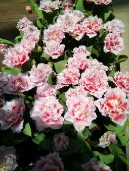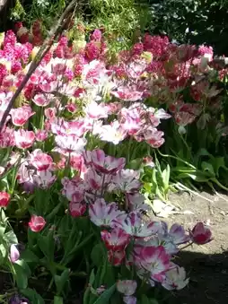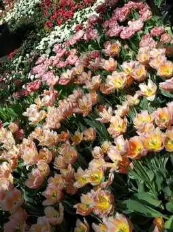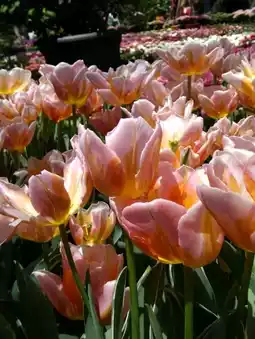 In the sun-drenched garden, a dazzling array of tulips is in full bloom, showcasing a spectacular palette of colors and forms. Delicate pink fringed tulips stand with snow-like grace, while bright golden-yellow blossoms form a vibrant sea of warmth. Elegant pink-and-white and purple-and-white varieties mingle with soft apricot-hued flowers, each adding its unique charm. Gathered together—some standing tall, others clustered in cheerful groups—these tulips, set against a backdrop of lush green leaves, compose the most brilliant symphony of spring.