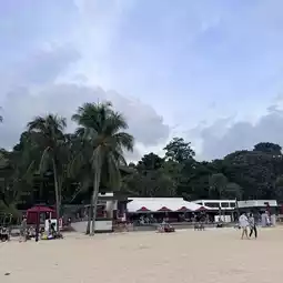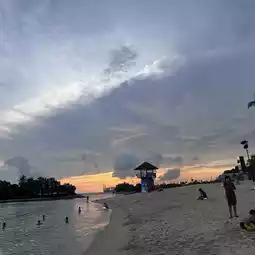 since there is no lifeguard services after 7pm, they disallow us to get into the waters. warning whistles can be heard when someone is spotted in the sea after 7pm.