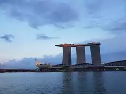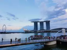 You can see the Marina Bay Sands Hotel across the water, making it a must-see tourist spot! It's packed with people!