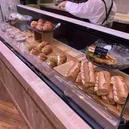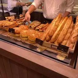On the first floor, they serve cake, bread, pastries, sandwiches, salad, coffee, tea…