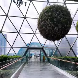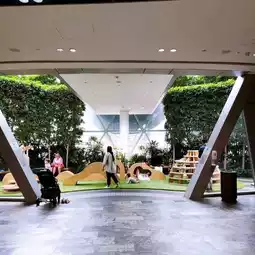 Forest Valley: a lush indoor garden with hundreds of trees, plants, and a 40-meter-tall indoor waterfall, the HSBC Rain Vortex.